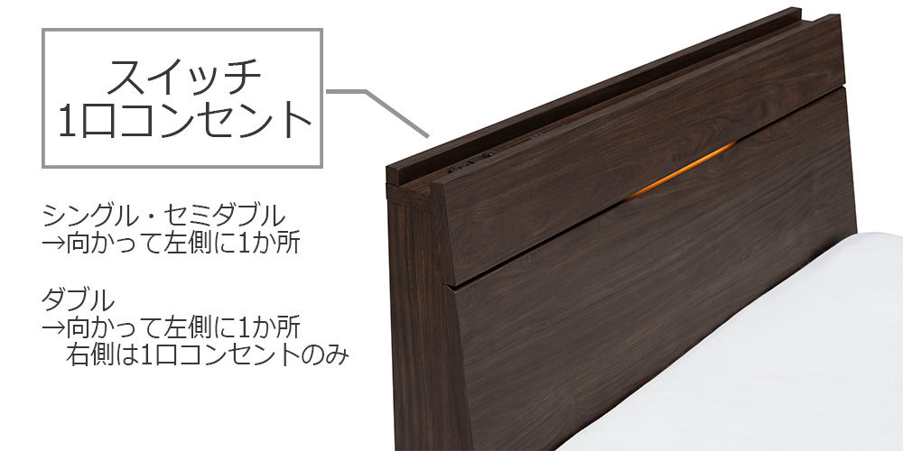 スリット部分にLED照明が付いており、枕元の明かりとして便利です。シングルとセミダブルは向かって左側にスイッチと1口スライドコンセント付きでスマートフォンなどの充電も可能です。ダブルは左側にスイッチと1口コンセント、右側は1口コンセントのみ付きます。