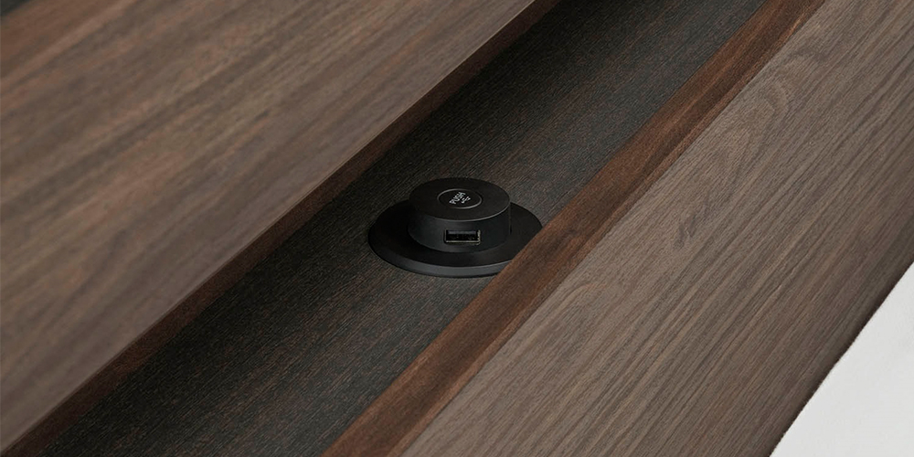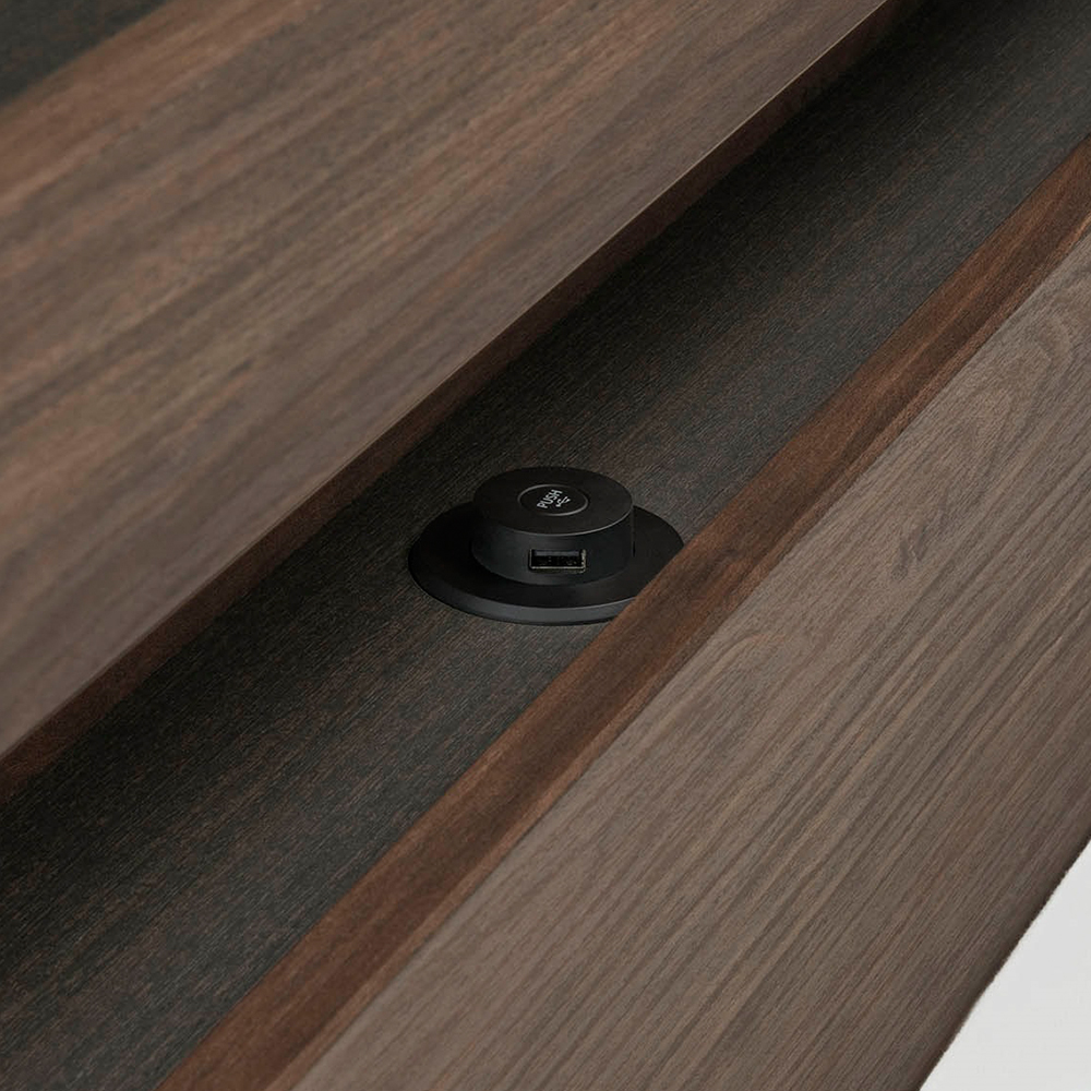 中央のボタンを押すことで出し入れ可能な2口USBポート付きです。使用していない時はすっきり収まります。向かって左側にスイッチと1口コンセントも付いています。