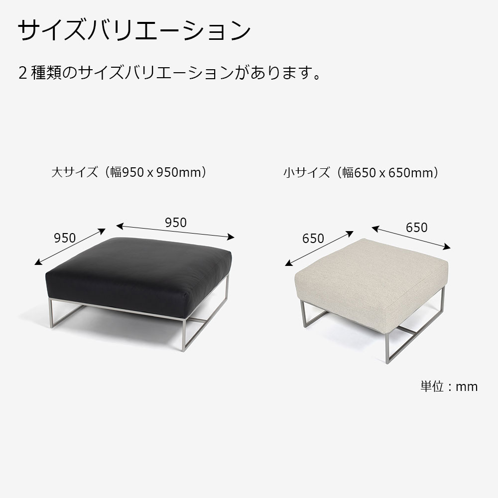 機能的なソファ「フォーエバーヤング」用のオットマンです。 座面には高密度ウレタンとフェザーを使用しています。