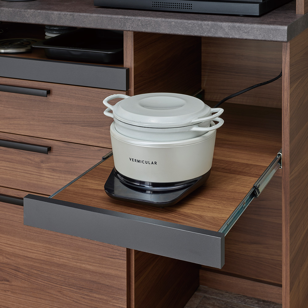 奥まで使いやすいフルスライド仕様です。ゆっくりなめらかに動かせるサイレントレールを使用しています。内部はデザインに合わせたダークグレーです。