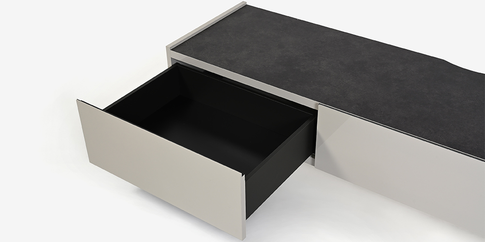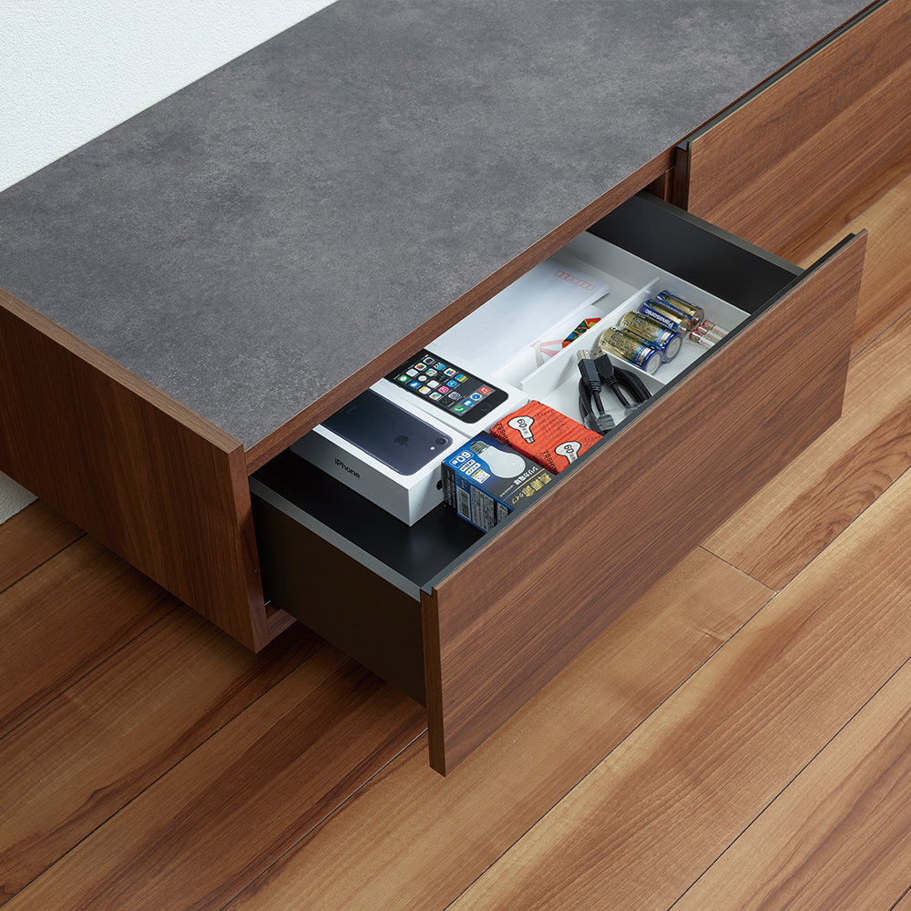 AV機器収納部のフラップ扉は引出しと同じ表面材を貼ったガラス製です。扉を閉めたままでもリモコン操作を行うことができます。