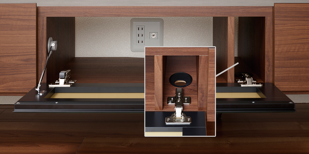 AV機器収納部のフラップ扉は引出しと同じ表面材を貼ったガラス製です。扉を閉めたままでもリモコン操作を行うことができます。