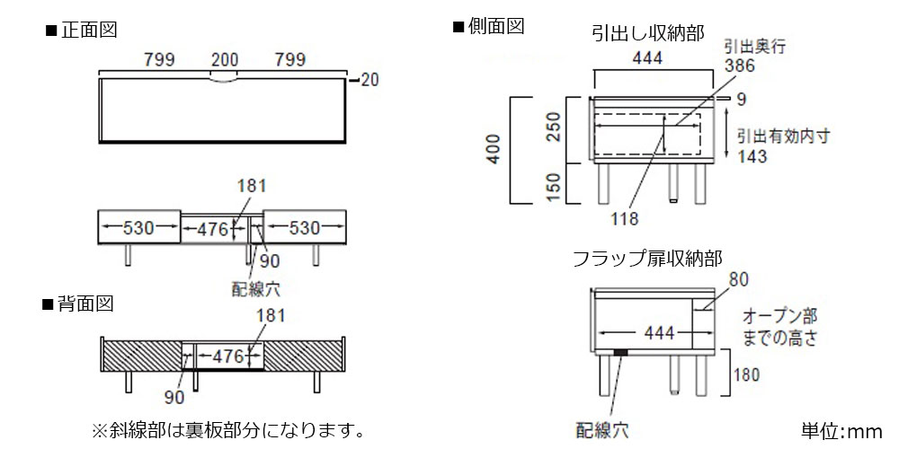 背面がオープン仕様となっているため壁面のコンセントがそのまま使用できます。右側のフリースペース底面には配線孔もあります。※画像は同シリーズのサイズ違いのものです。