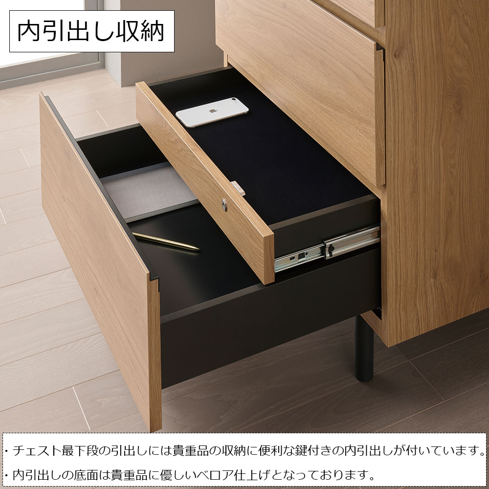 奥までしっかりと見渡せるフルスライド仕様です。ドイツ、ヘティヒ社のサイレントレールを使用しており、静かでなめらかな開閉が可能です。最下段の引出しには貴重品の収納に便利な鍵付きの内引出しが付いています。内引出し底面は貴重品に優しいベロア仕上げとなっております。