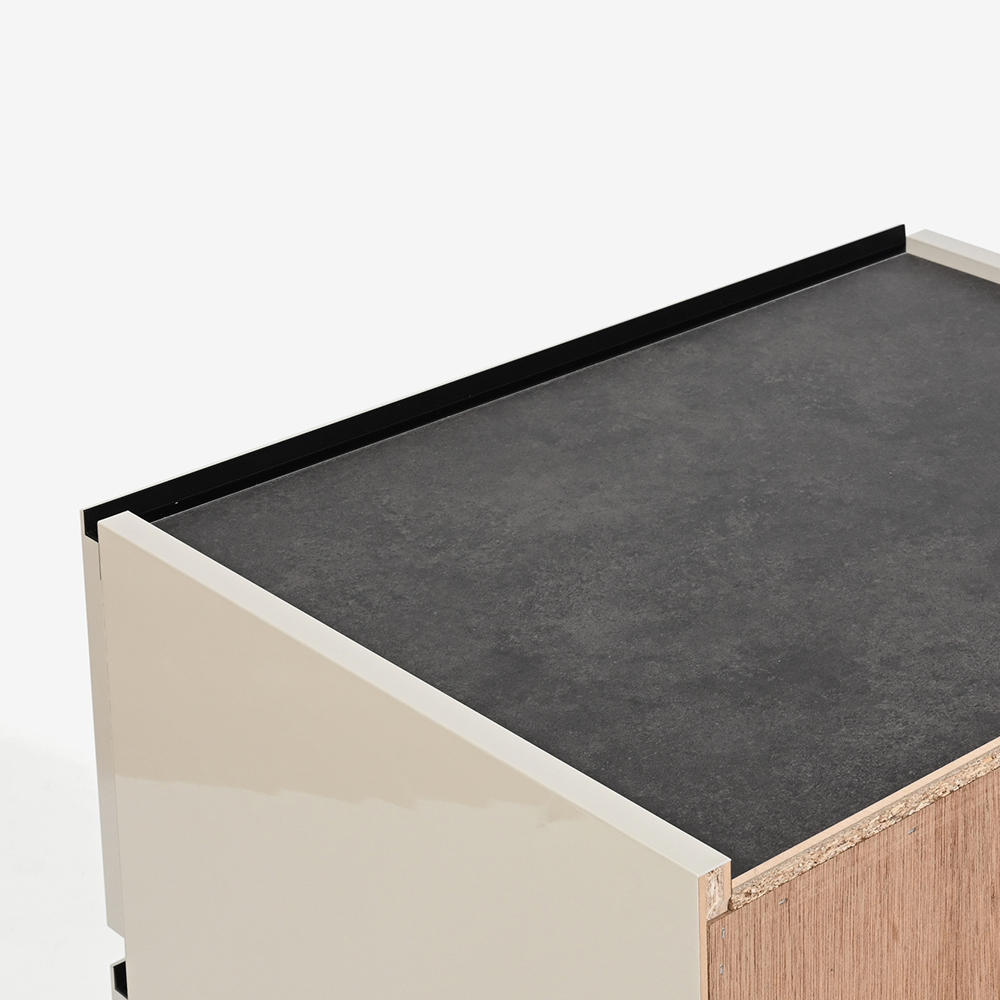 石目のような柄の樹脂化粧シートで仕上げています。上品なベージュ色で、高級感のあるお部屋に仕上げます。