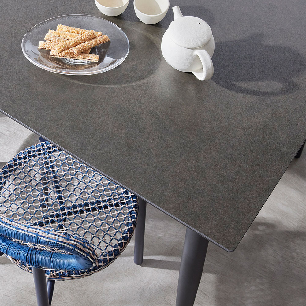キッチンカウンターにも使用されるキズや熱に強い機能性の高いセラミックを天板に使用したモダンなダイニングテーブルです。エッジの効いたスチール脚のデザインがアクセントになっています。