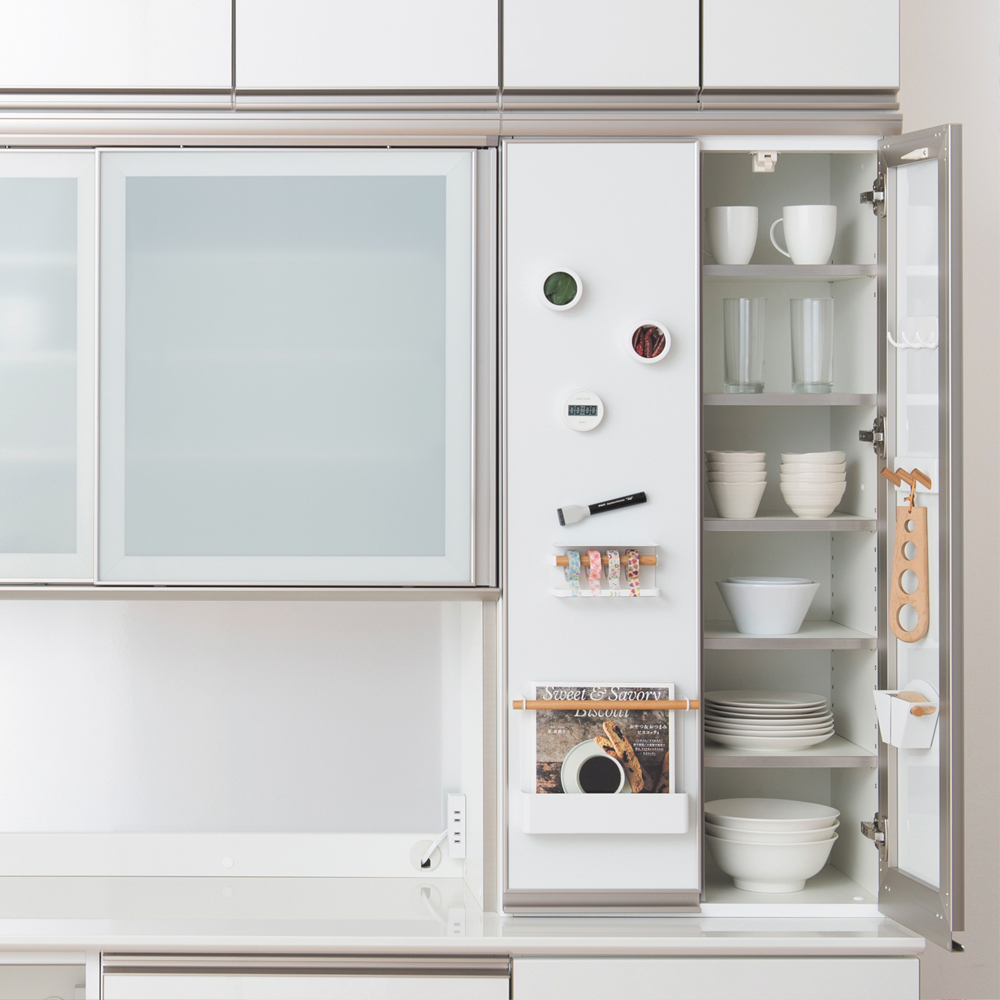 使い方によって幅広い用途で便利に活躍してくれるマグネットですが、使える場所が限られるのが最大の欠点です。そのような要望にお答えして、食器棚の扉をホワイトボードにしました。扉の外側だけでなく、内側にもマグネットが効きます。※マグネットを貼り付ける場合、扉の耐荷重は約2kgです。筆記する場合は、ホワイトボード専用マーカーをご使用ください。