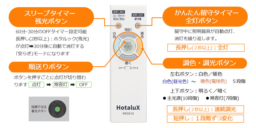 調光・調色機能で生活シーンに合わせた明かりを選べます。ちょっとした防犯対策に「かんたん留守タイマー機能」搭載。スリープタイマー(30分・60分)設定可能。消灯後も停電時もあかりを確保できる「ホタルック機能」付きと機能性も十分です。