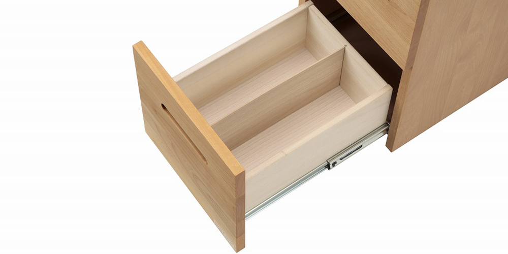 すべての引出しに金属レールを採用し、開け閉めがスムーズです。※画像はレールのイメージです。サイズ違いのものです。