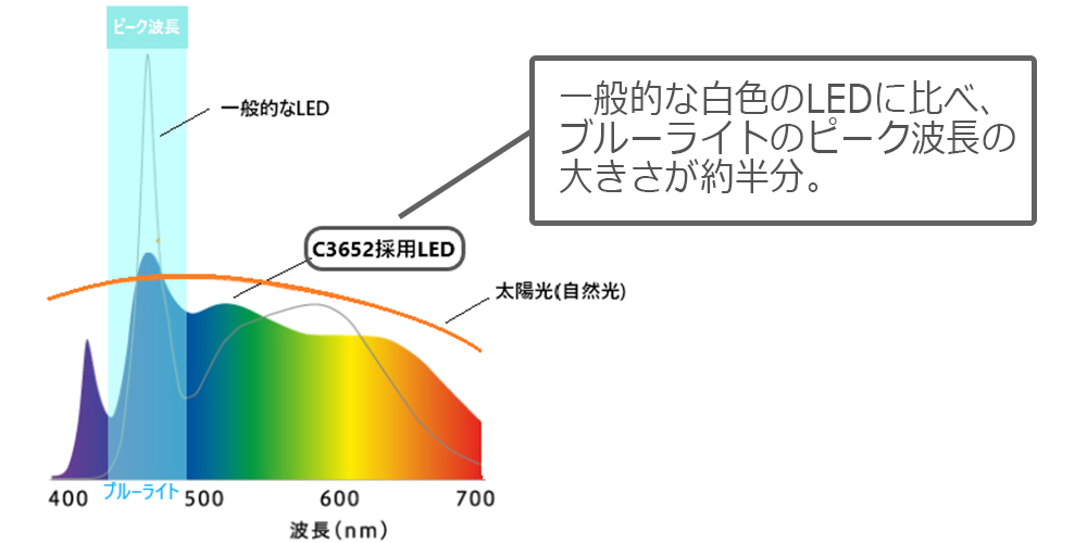 一般的な白色のLEDに比べ、ブルーライトのピーク波長の大きさが約半分。太陽光LEDとも呼ばれ、目に悪影響のあるブルーライトをカットすることにより、目を守ります。