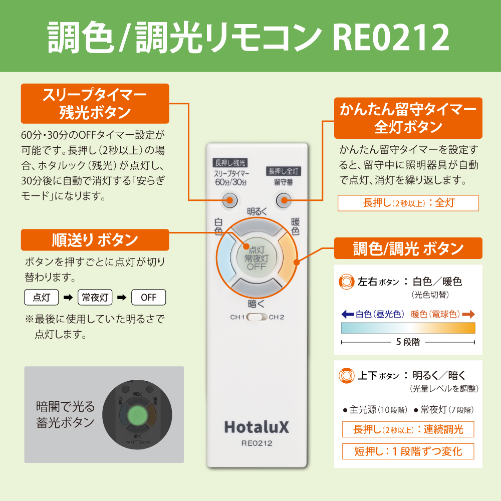 調光・調色リモコン付:調色5段階 昼光色〜電球色、調光10段階、常夜灯7段階調光