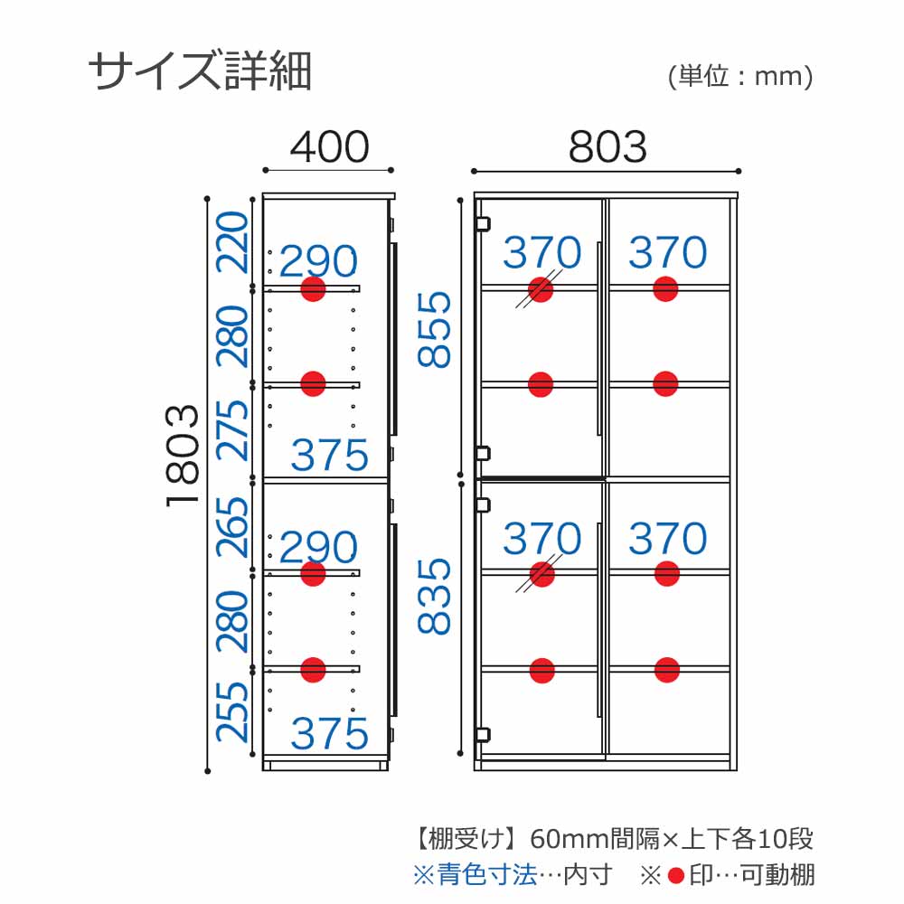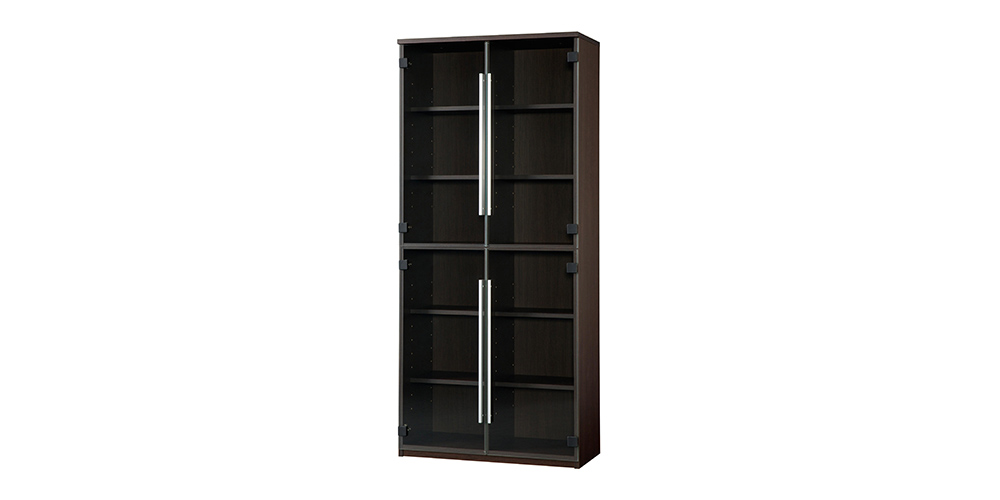 棚板はすべて可動棚で、棚板の高さ調整が可能なシンプルなデザインの書棚です。ほこりの侵入も防ぎながら、扉を開けなくても中のものを確認できる、使い勝手のよいガラス扉付きです。