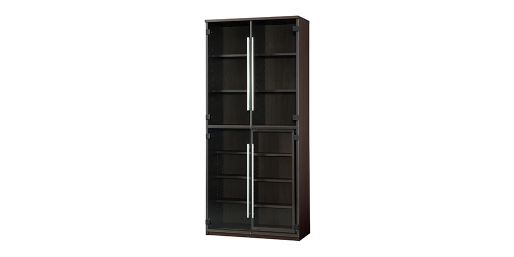 棚板はすべて可動棚で、高さ調整が可能なシンプルなデザインの書棚です。下台のスライド扉部分は奥行き浅めの前後2列で収納力が高く、文庫本なども収納しやすい仕様。ほこりの侵入も防ぎながら、扉を開けなくても中のものを確認できる、使い勝手のよいガラス扉付きです。