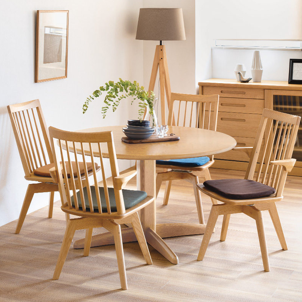 格子の背もたれがすっきりとした印象を与え、インテリアのテイストを選ばず、合わせやすいダイニングチェアです。オーク材を使用しており、天然木のやさしい風合いが感じられます。椅子を引かずに立ち上がれる回転椅子です。