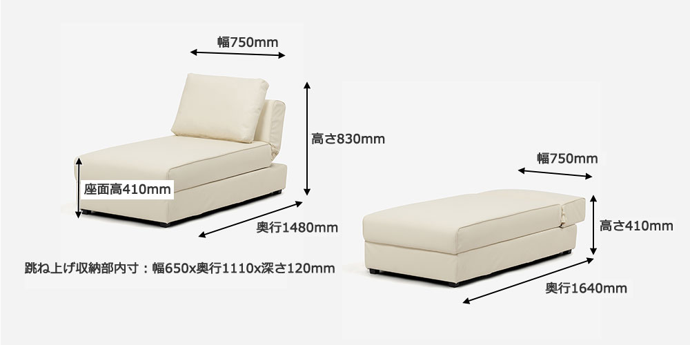 座面下には跳ね上げ式の大容量の収納スペースを備えています。収納スペース寸法:幅650X奥行1110X高さ120mm