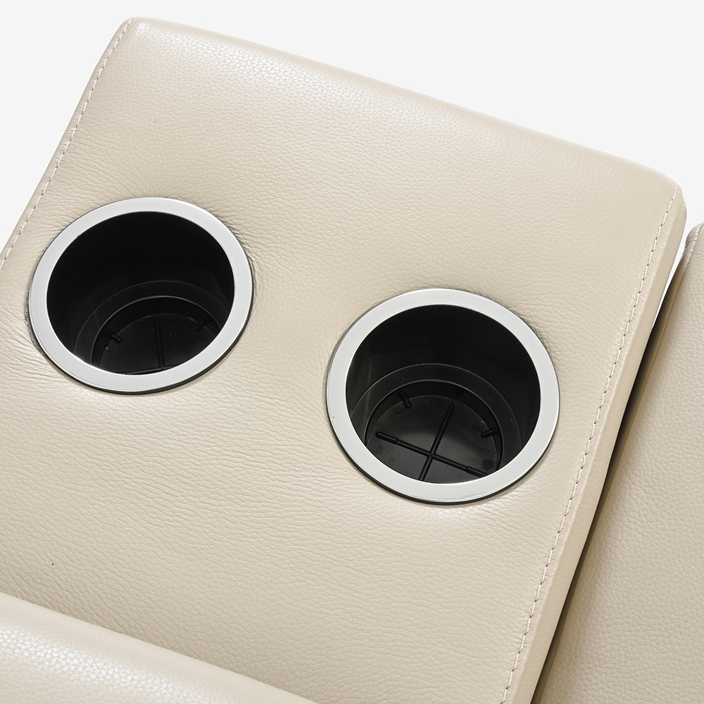 背もたれや脚元に施された絞りや、角にあしらわれた美しいステッチが控えめながらアクセントのポイントとなり、ソファの表情を形づくっています。電動リクライニングタイプはボタンがアームの内側にあることで、ボタンが見やすく操作しやすいのが特徴です。また、テーブルユニットについているカップホルダーはコップの水滴がついてもお手入れがしやすいよう、取り外すことができるようになっています。美しさだけでなく、日々の使いやすさまでを丁寧にデザインに落とし込んで仕上げられています。