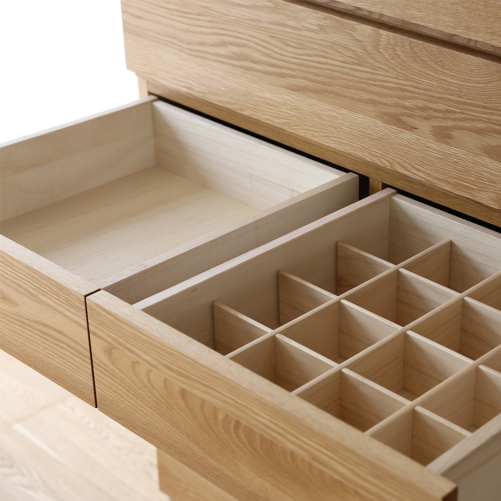 向かって右側の小引出には小物や下着の収納に便利なランジェリーBOXが付属します。※画像はローチェスト幅120cmのものです。ハイチェスト幅90cmのランジェリーBOXは16個に区切られています。