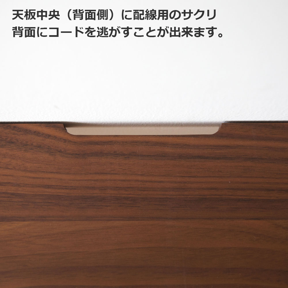 ウォールナット材突板を使用し、素材感を感じられる天板です。天板中央の背面側にはコードを背面に逃がせるサクリ(幅10cm)が施されています。