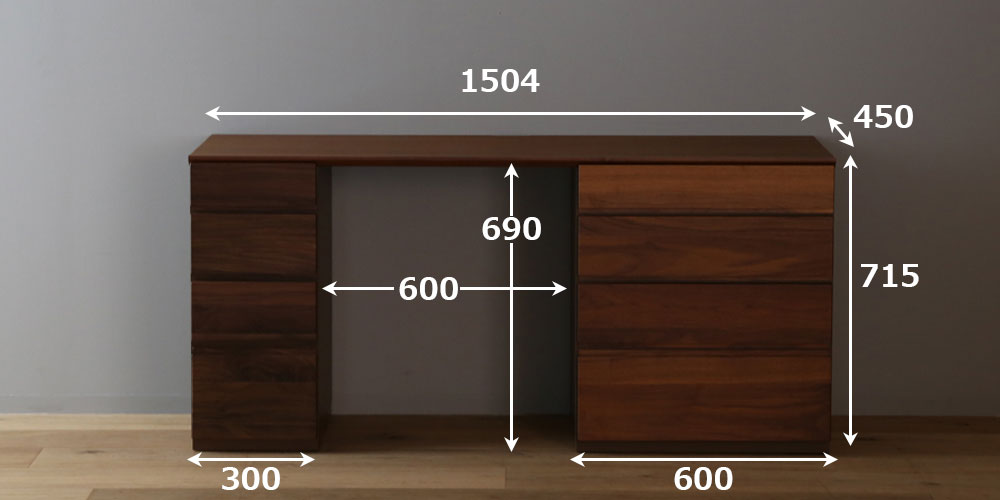 大小4杯の引出しを備えたチェストです。フルスライドレールを使用しており、奥のものまで取り出しやすい仕様です。前板にはウォールナット無垢材を使用しており、天然木ならではの質感も魅力です。