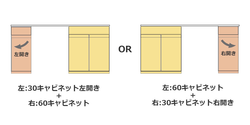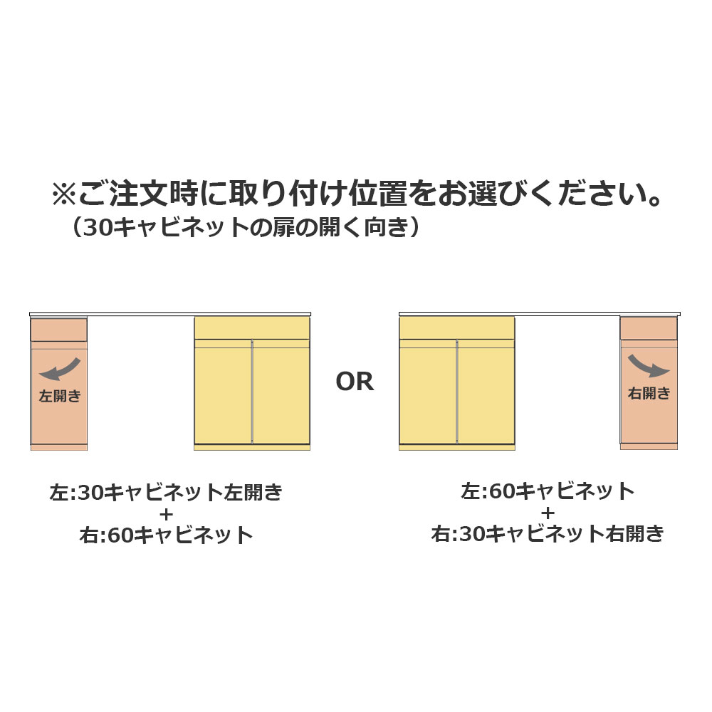 設置するスペースに合わせて、30キャビネット(扉の開く向き)と60キャビネットの位置をお選びください。