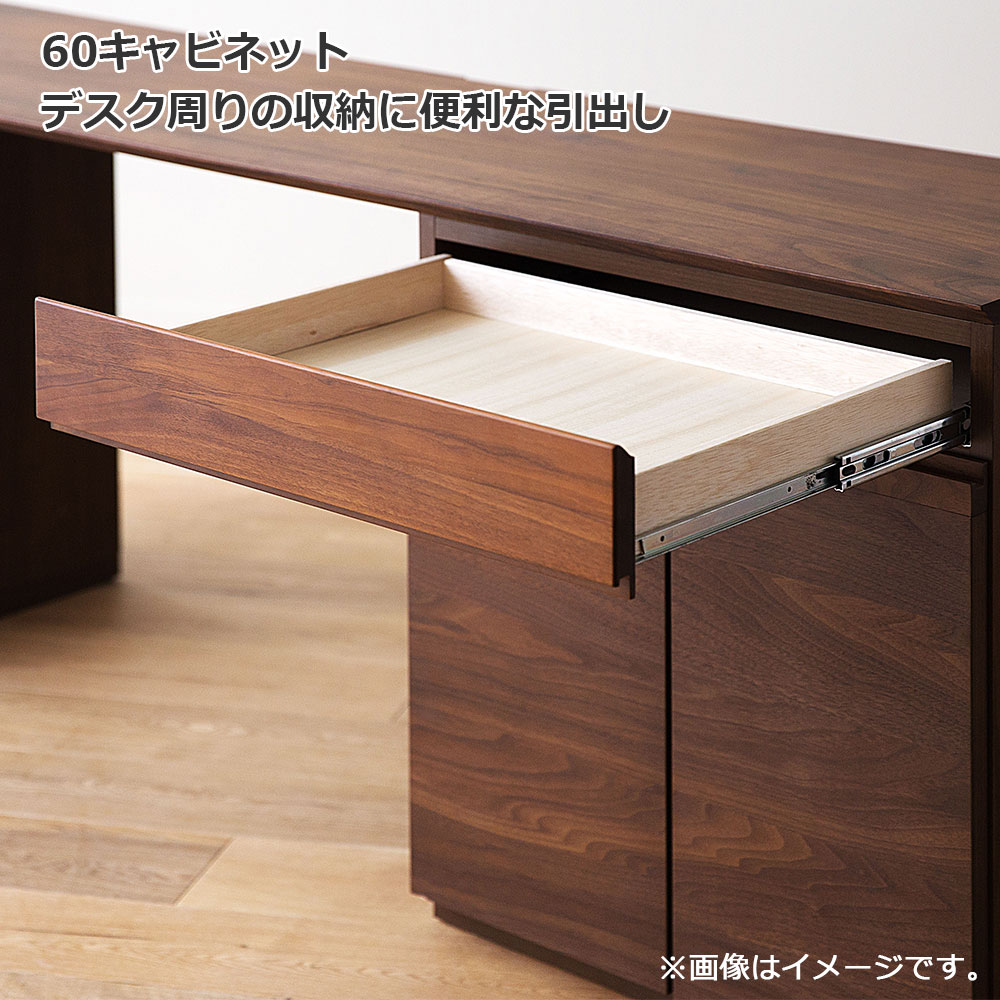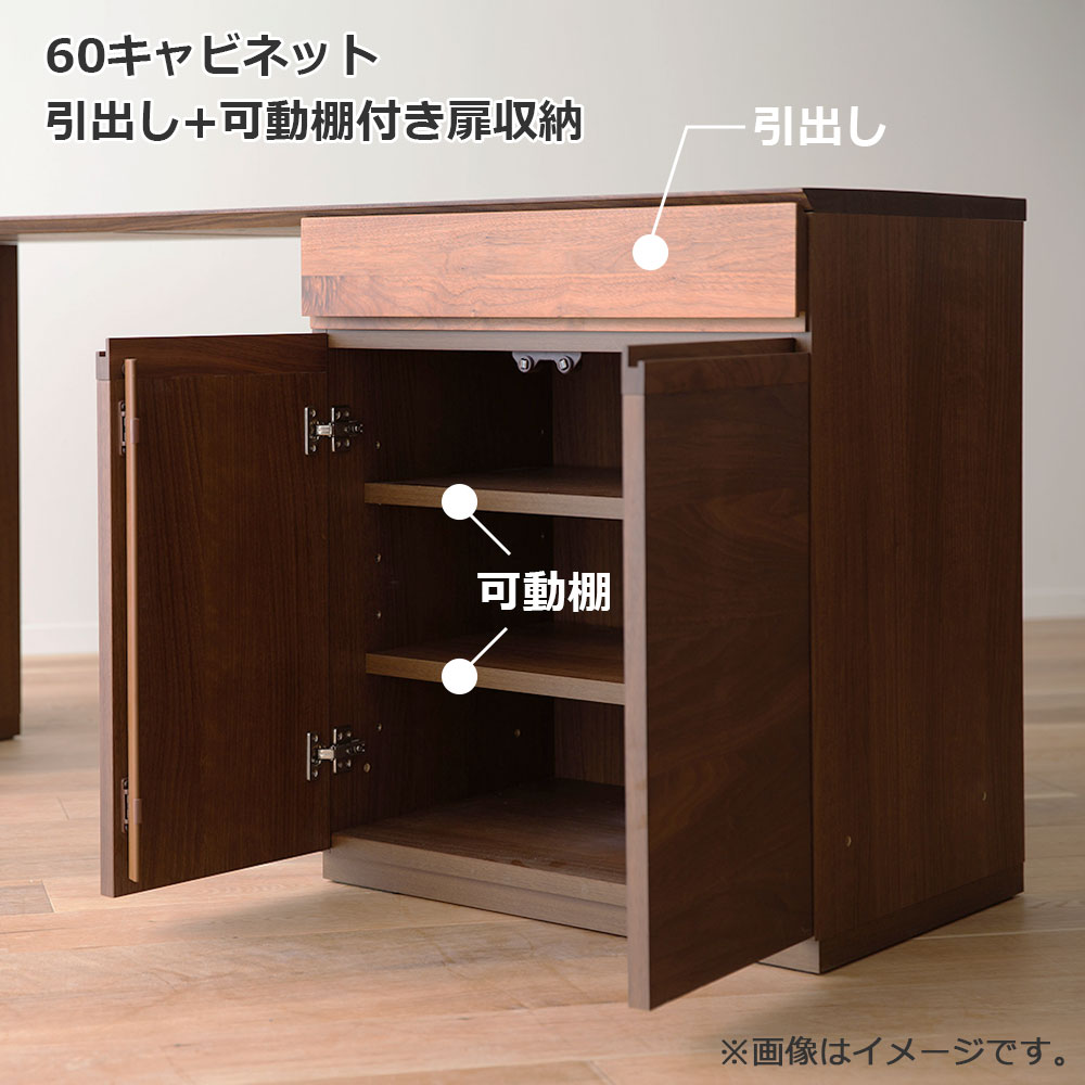 幅60cmでたっぷり収納できる両開きのキャビネット。キャビネットは引出しの前板にウォールナット無垢材、扉にウォールナット突板を使用しており、天然木ならではの質感も魅力です。