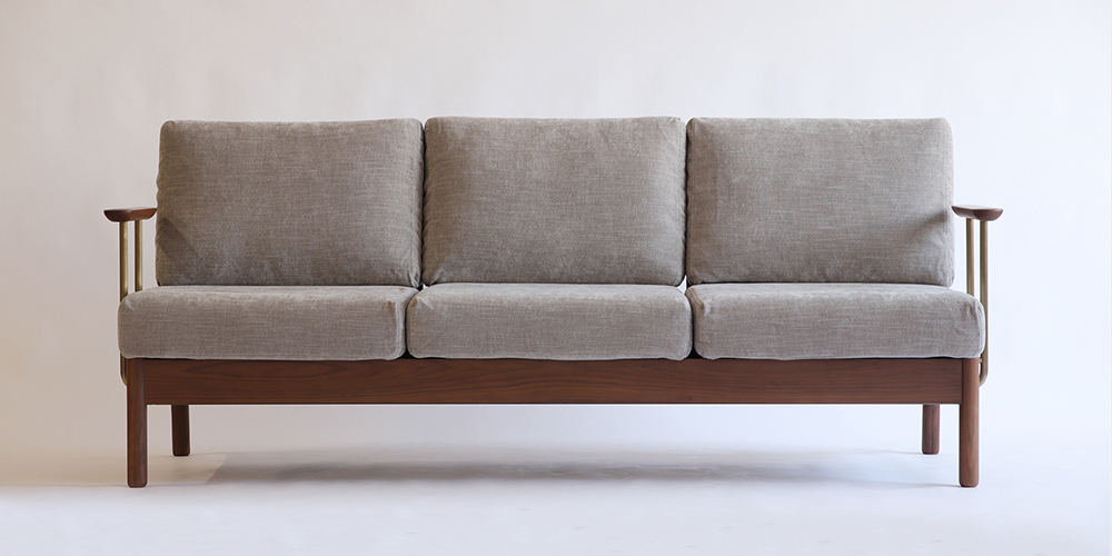 天然の無垢材と金属のコンビネーションによる彫刻的なアームが印象的なソファです。カバーリング仕様でファブリックカバーを取り外してお手入れすることができます。※画像はS25ミディアムグレーです。