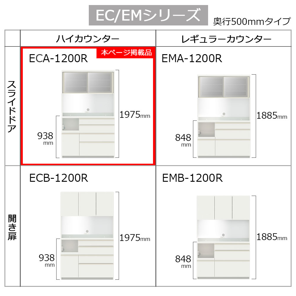 EC/EMシリーズはカウンター高(93.8cm/84.8cm)、奥行き(50cm/44.5cm)、カウンター上の扉タイプ(スライドドア/開き扉)をそれぞれ2種類からお選びいただけます。