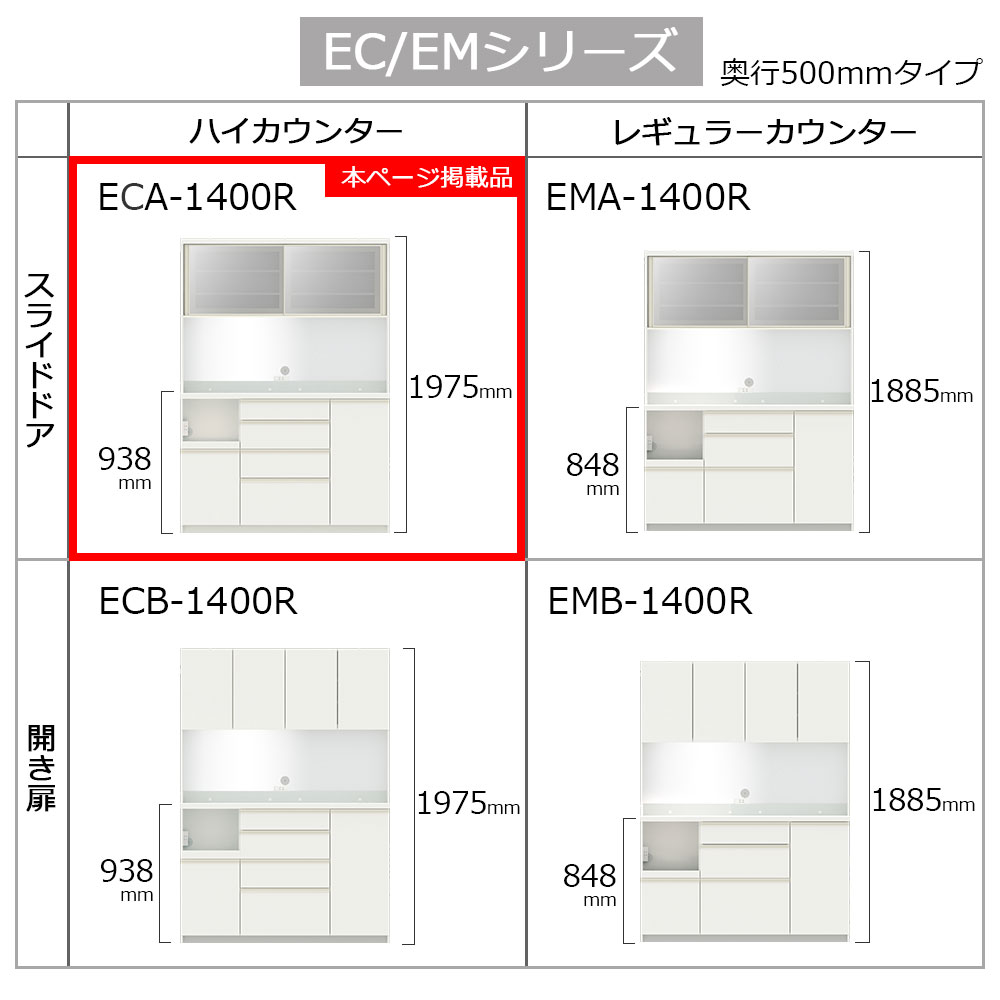 EC/EMシリーズはカウンター高(93.8cm/84.8cm)、奥行き(50cm/44.5cm)、カウンター上の扉タイプ(スライドドア/開き扉)をそれぞれ2種類からお選びいただけます。