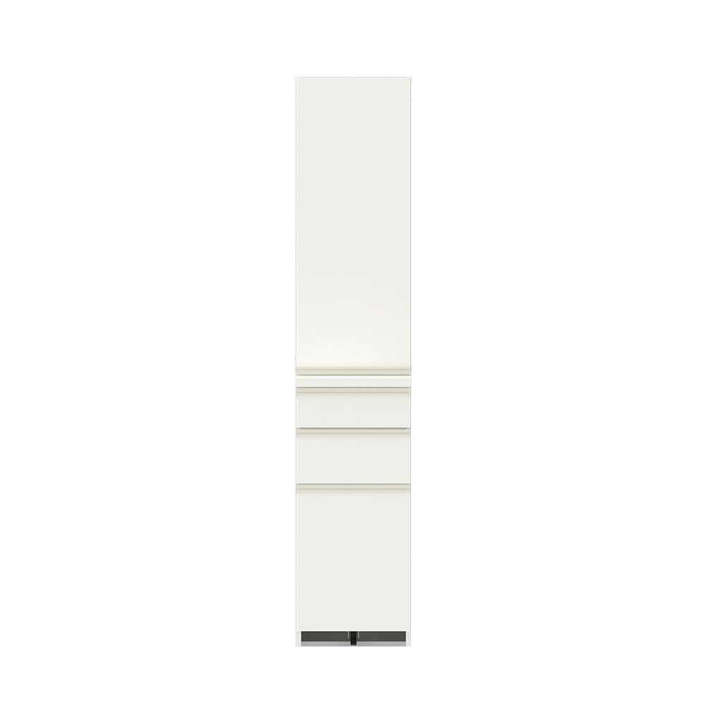 家電収納の下は背の高いものやダストボックスの収納に便利な深型の引出し付きです。パモウナ「オプションダストボックス」の15Lタイプの場合は2個まで、26.5Lタイプの場合は1個、収納可能です。ダストボックスを収納しない場合は、引出し内に棚板を設置することも可能です。向かって右側は扉収納になっており、食品ストックやキッチンツールの収納に便利です。