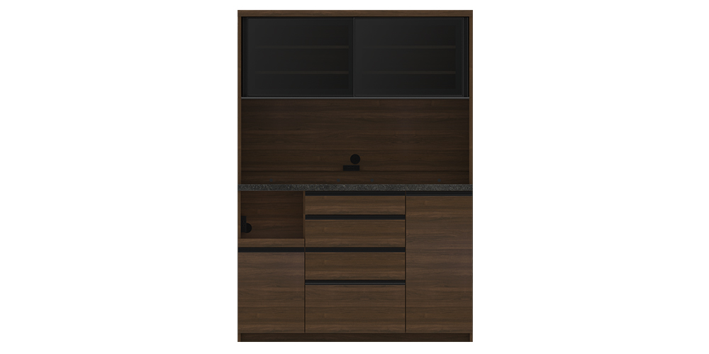 ウォールナット木目にブラックのパーツがアクセントになっています。リビングダイニングのインテリアとも相性が良く、あたたかみのある印象です。