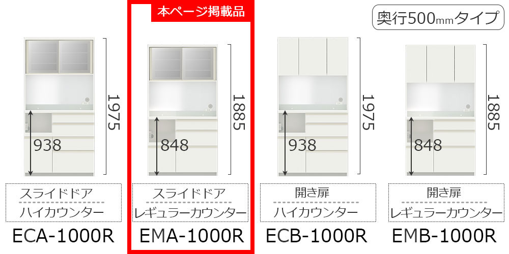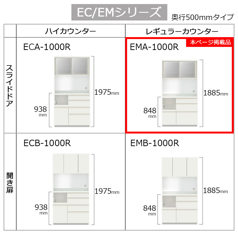 EC/EMシリーズはカウンター高(93.8cm/84.8cm)、奥行き(50cm/44.5cm)、カウンター上の扉タイプ(スライドドア/開き扉)をそれぞれ2種類からお選びいただけます。