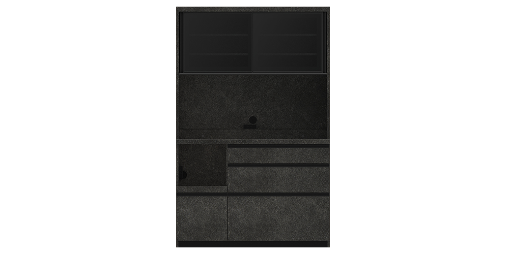 色柄に連動したガラス扉、引手、コンセント、天板の色で統一感のあるデザインが魅力です。側面も前面と同じ柄になっており、側面が見えるレイアウトでもインテリア性を損ないません。低めのカウンターでオープン部分が使いやすいレギュラーカウンターは、総高も低く、上台の収納物も取り出しやすい設計です。
