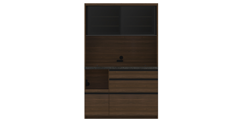 色柄に連動したガラス扉、引手、コンセント、天板の色で統一感のあるデザインが魅力です。側面も前面と同じ柄になっており、側面が見えるレイアウトでもインテリア性を損ないません。低めのカウンターでオープン部分が使いやすいレギュラーカウンターは、総高も低く、上台の収納物も取り出しやすい設計です。