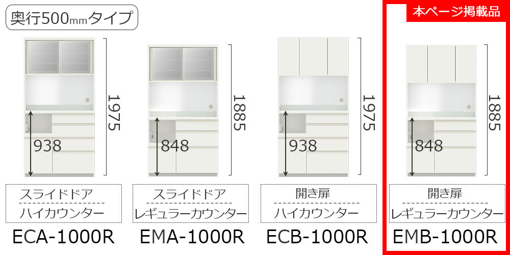 EC/EMシリーズはカウンター高(93.8cm/84.8cm)、奥行き(50cm/44.5cm)、カウンター上の扉タイプ(スライドドア/開き扉)をそれぞれ2種類からお選びいただけます。