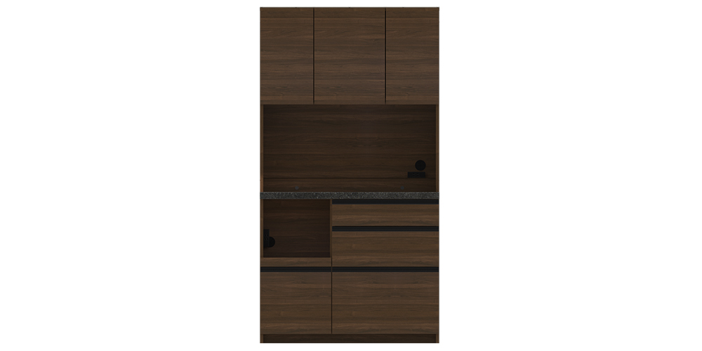 ウォールナット木目にブラックのパーツがアクセントになっています。リビングダイニングのインテリアとも相性が良く、あたたかみのある印象です。