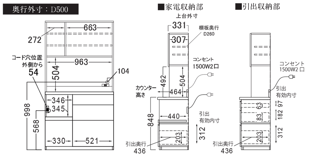 | 家電収納部分 | 幅346x奥行440x高さ345 |