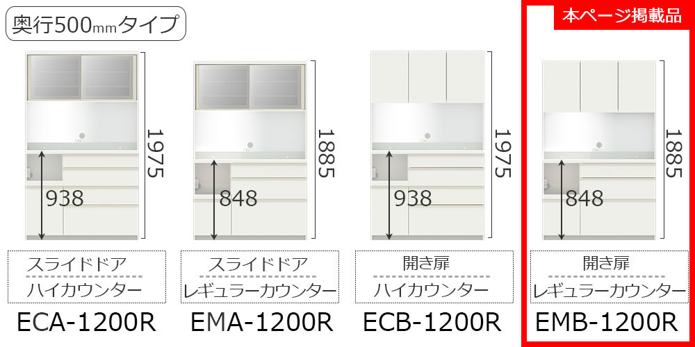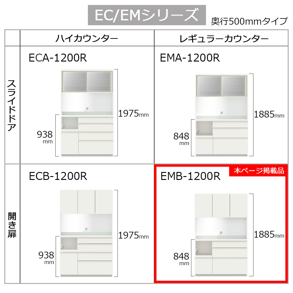 EC/EMシリーズはカウンター高(93.8cm/84.8cm)、奥行き(50cm/44.5cm)、カウンター上の扉タイプ(スライドドア/開き扉)をそれぞれ2種類からお選びいただけます。