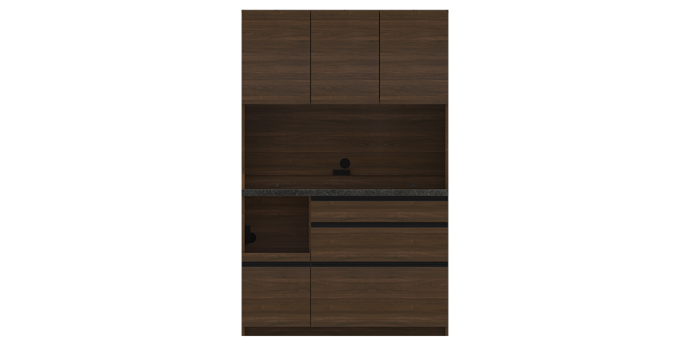 引出しのすべてにソフトクローズを採用し、快適な使い心地にこだわったニュースタンダードモデル。清潔感のあるホワイト、インテリアとのコーディネートをお楽しみいただけるウォールナット、セラミカネロの3色展開です。低めのカウンターでオープン部分が使いやすいレギュラーカウンターは、総高も低く、上台の収納物も取り出しやすい設計です。※画像はイメージです。