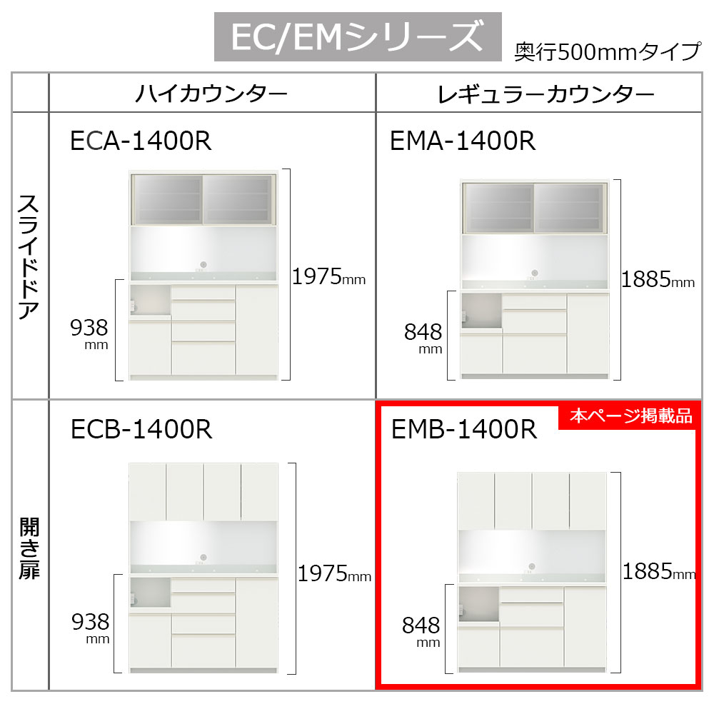 EC/EMシリーズはカウンター高(93.8cm/84.8cm)、奥行き(50cm/44.5cm)、カウンター上の扉タイプ(スライドドア/開き扉)をそれぞれ2種類からお選びいただけます。