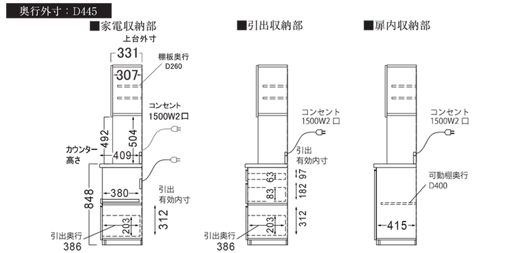 | 家電収納部分 | 幅346x奥行380x高さ345 |