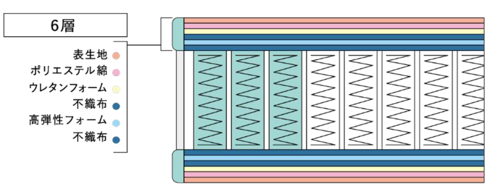 7.7インチの最高グレードポケットコイルを使用し、Sサイズで1080本のコイルが身体の凹凸や睡眠時の動きにもきめ細かくフィットします。詰め物にはソフト感がありながら弾性に優れた高弾性フォームを使用することで、優しく身体を支えます。