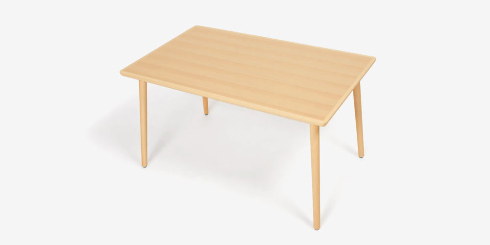 あたたかくやさしいブナ材の風合いは北欧テイストなどのナチュラルなインテリアコーディネートにぴったりです。天板はブナ材突板を使用し、軽さを実現しています。天板の縁部分を無垢材にすることで、椅子の出し入れによるキズも目立ちにくい仕様です。