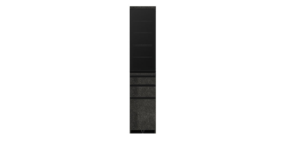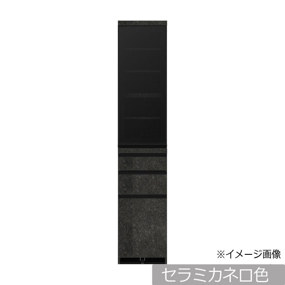 キッチンのスペースに合わせて追加することでより収納を増やすことが出来る幅40cmのサイドキャビネットです。設置場所に合わせて扉の開く向きをお選びください。ECAシリーズは色柄に連動したガラス扉、引手で、統一感のあるデザインが魅力です。側面も前面と同じ柄になっており、側面が見えるレイアウトでもインテリア性を損ないません。スリムな奥行45.5cmタイプです。※画像はイメージです。