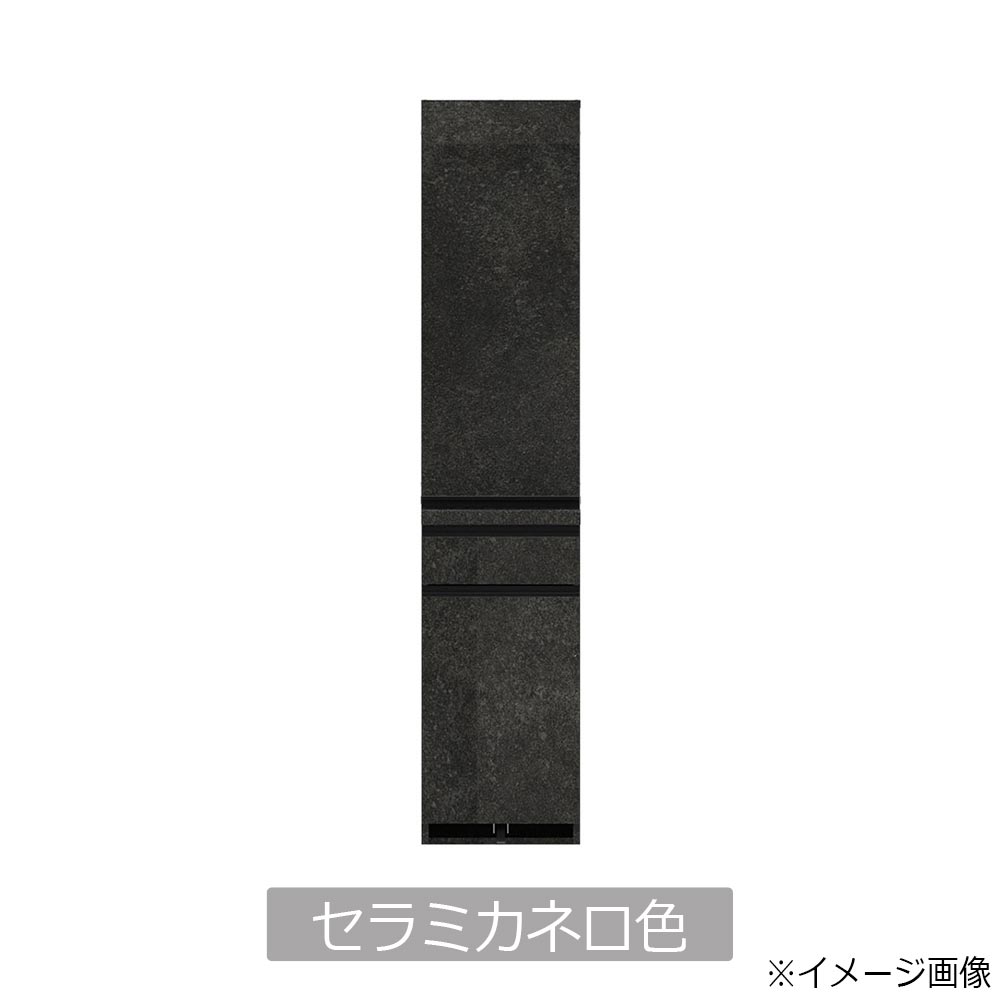 キッチンのスペースに合わせて追加することでより収納を増やすことが出来る幅40cmのサイドキャビネットです。設置場所に合わせて扉の開く向きをお選びください。EMBシリーズは食器を隠して収納できる板扉仕様で、フラットなデザインが魅力です。側面も前面と同じ柄になっており、側面が見えるレイアウトでもインテリア性を損ないません。スリムな奥行44.5cmタイプです。※画像はイメージです。