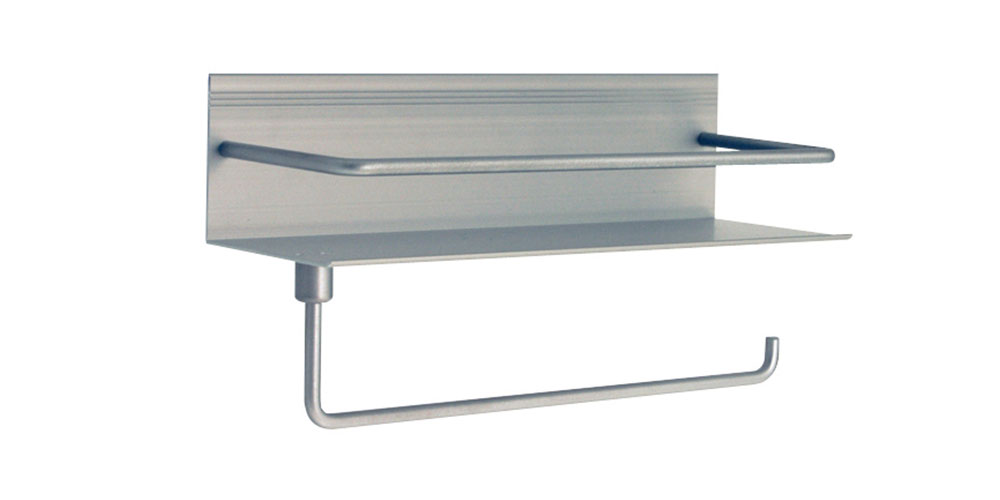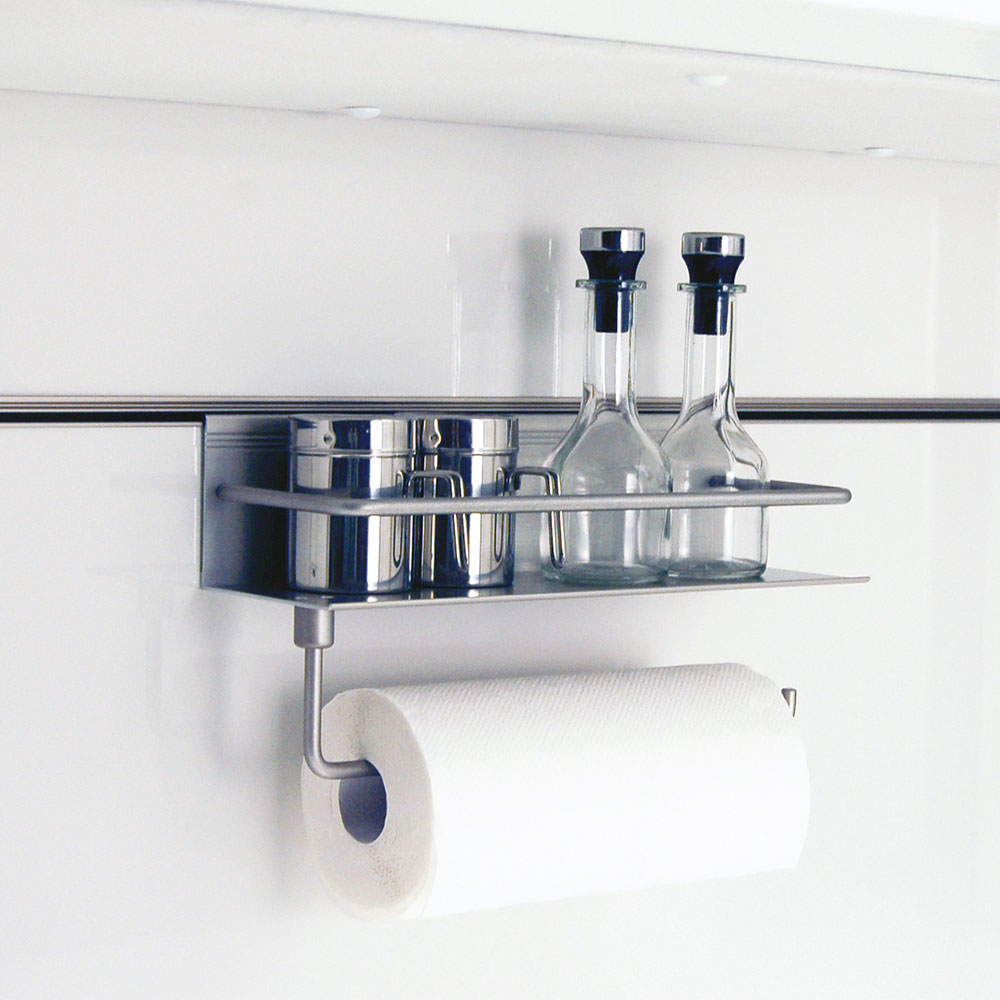 バックパネルのレールに簡単に取り付けることができ、スパイスや小物などを置くことができます。※綾野製作所の対応アイテムに取付けてお使いください。画像はイメージです。小物類は付属しません。