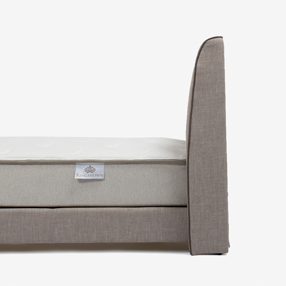 マットレスを囲うような形とパイピングが印象的な美しいデザインです。角がきれいにでるように、サイドフレームとフットボードを框に組んだこだわりの仕上げです。※マットレスは別売りです。