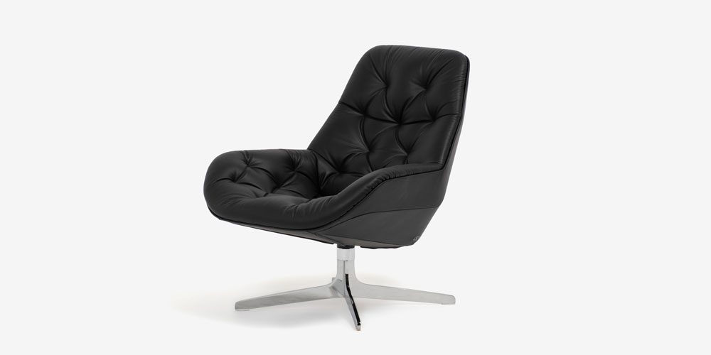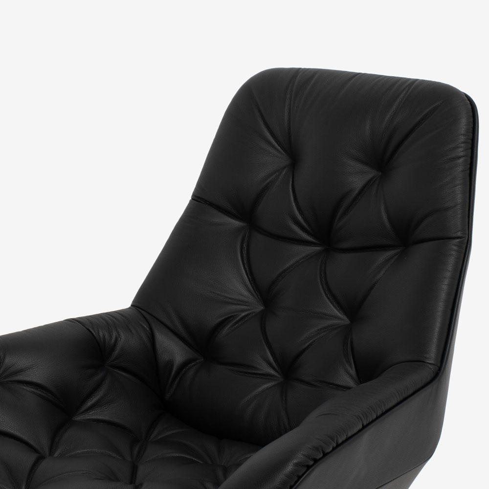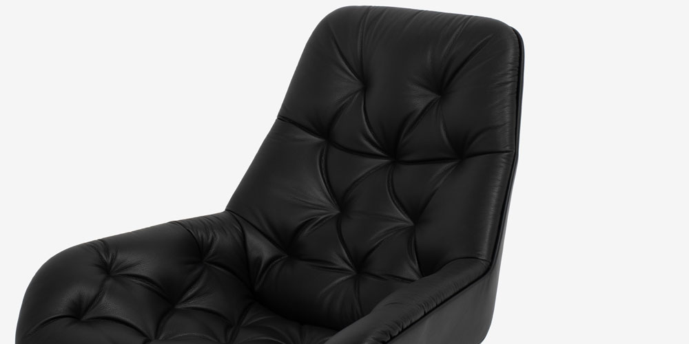 コンパクトなサイズながら、背もたれの絶妙なタフティングにより快適な座り心地を実現しています。ステッチやパイピング、タフティングのシワ感といった、ディテールに高い張り込み技術が感じられます。