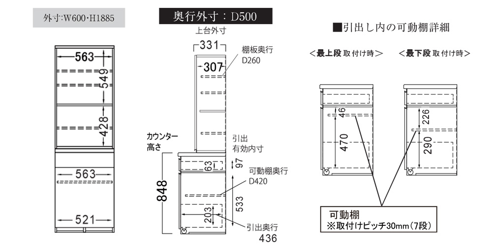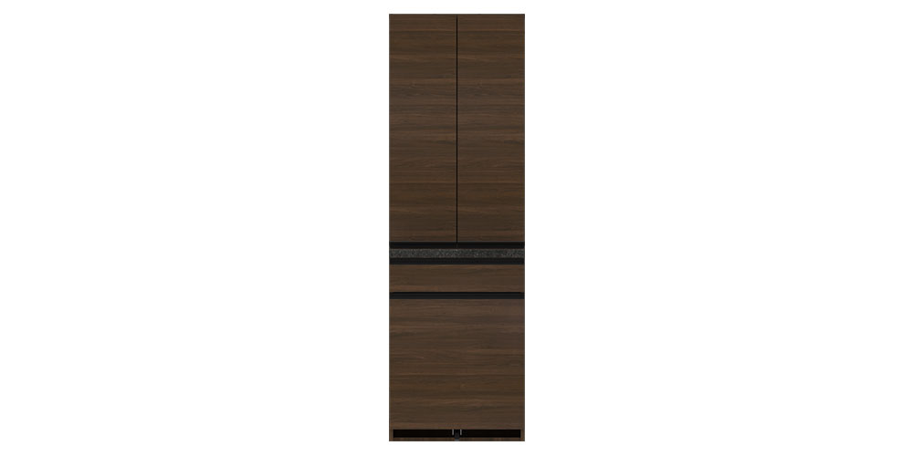 キッチンのスペースに合わせて追加することでより収納を増やすことが出来る幅60cmのサイドキャビネットです。EMBシリーズは食器を隠して収納できる板扉仕様で、フラットなデザインが魅力です。側面も前面と同じ柄になっており、側面が見えるレイアウトでもインテリア性を損ないません。※画像はイメージです。