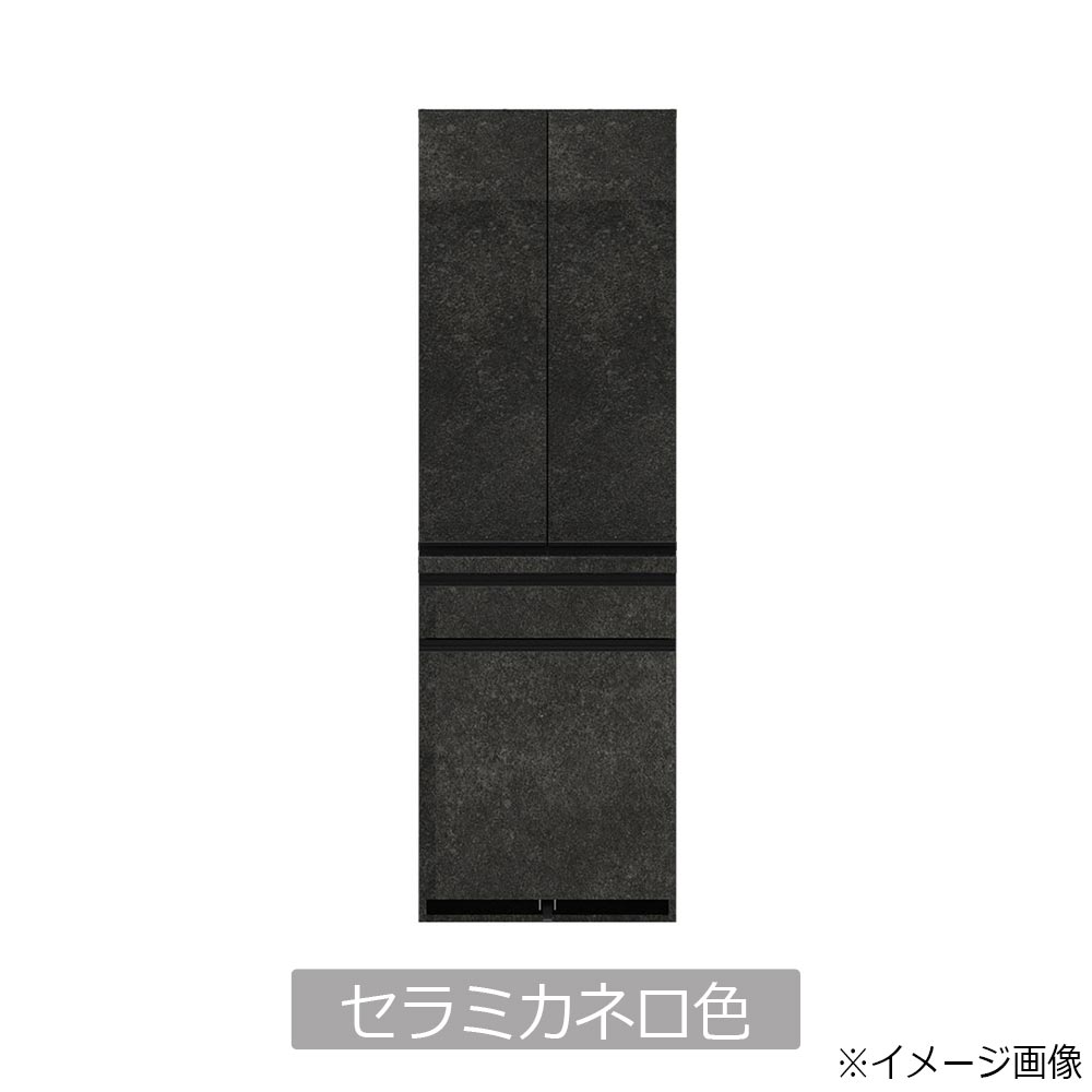 キッチンのスペースに合わせて追加することでより収納を増やすことが出来る幅60cmのサイドキャビネットです。EMBシリーズは食器を隠して収納できる板扉仕様で、フラットなデザインが魅力です。側面も前面と同じ柄になっており、側面が見えるレイアウトでもインテリア性を損ないません。スリムな奥行44.5cmタイプです。※画像はイメージです。