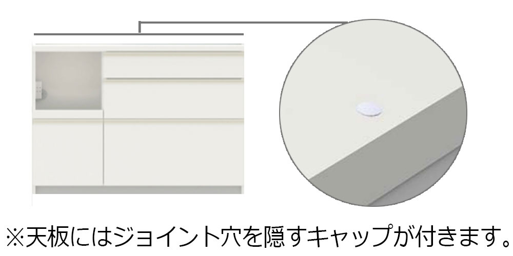 オープンボードの下台のみをカウンターとしてお使いいただく仕様です。そのため、天板には上台とのジョイント穴を隠す樹脂製のキャップが複数個所付きます。予めご了承ください。※画像はイメージです。ウォールナットとセラミカネロにはブラックのジョイントカバーが付きます。